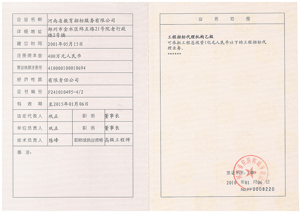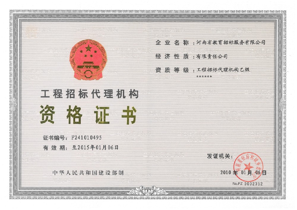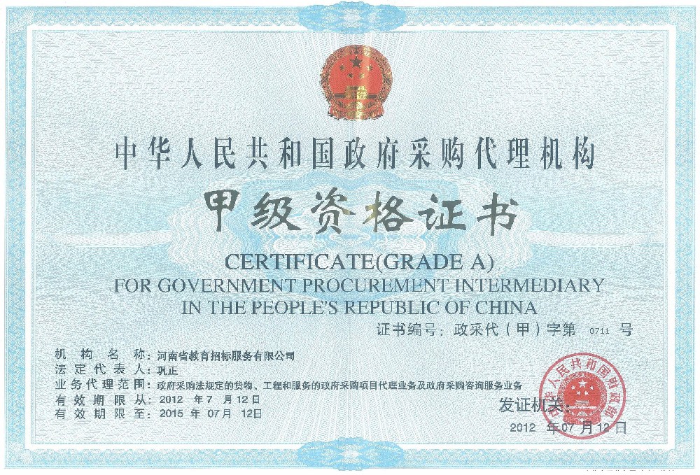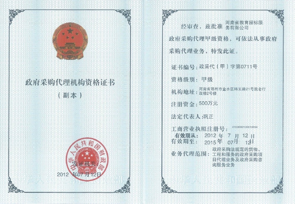 河南省教育招標(biāo)服務(wù)有限公司于2001年5月在河南省工商行政管理局注冊登記成立,具有獨(dú)立法人資格,注冊資本1000萬元人民幣,擁有中華人民共和國政府采購招標(biāo)代理甲級和工程招標(biāo)代理乙級雙重資質(zhì),并通過質(zhì)量管理體系認(rèn)證、環(huán)境管理體系認(rèn)證、職業(yè)健康安全管理體系認(rèn)證和榮獲AAA信用評估。能夠承辦政府采購代理業(yè)務(wù)及政府采購咨詢服務(wù)、工程招標(biāo)代理業(yè)務(wù)、水利招標(biāo)等業(yè)務(wù)的社會中介組織。